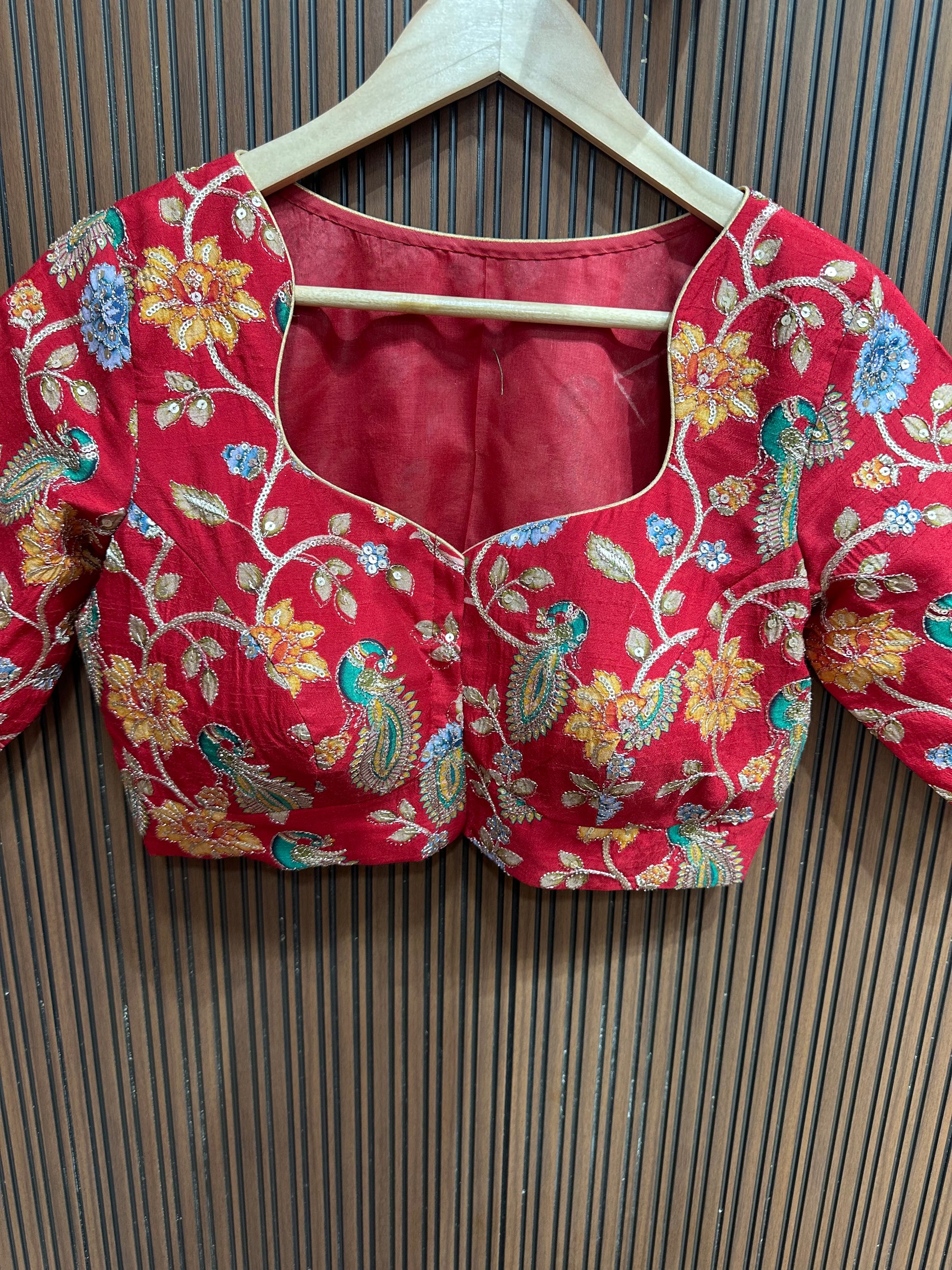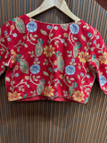Red kalamkari stitched blouse L to XXL size margin high neck pattern.