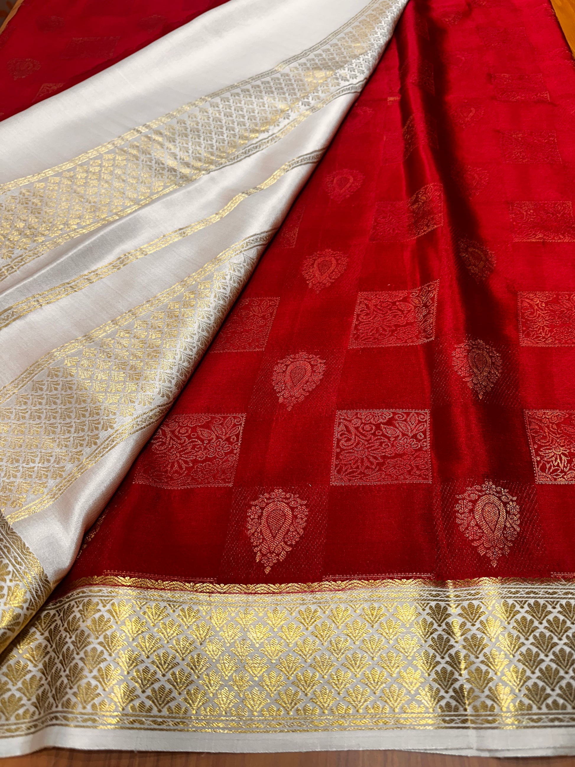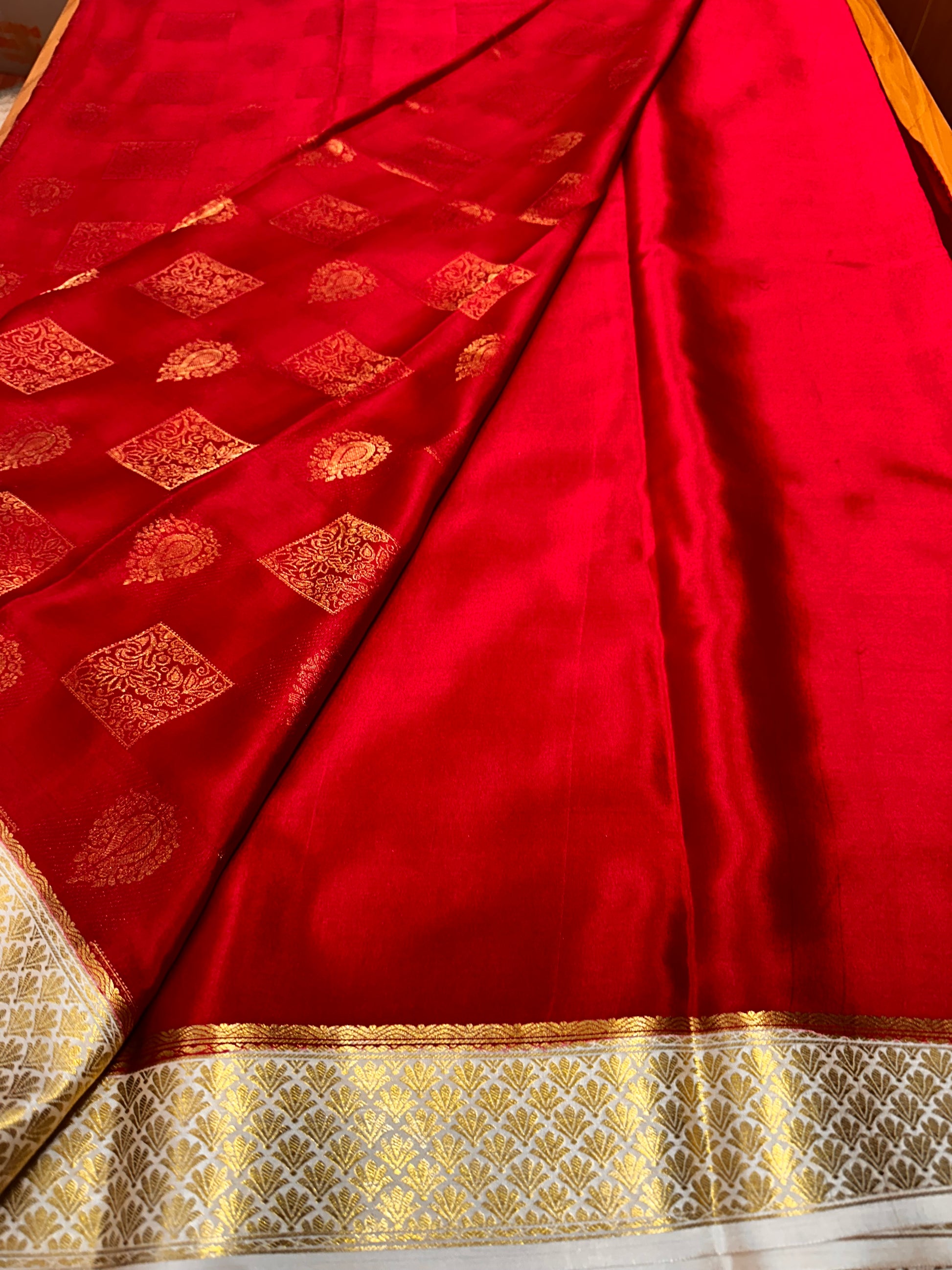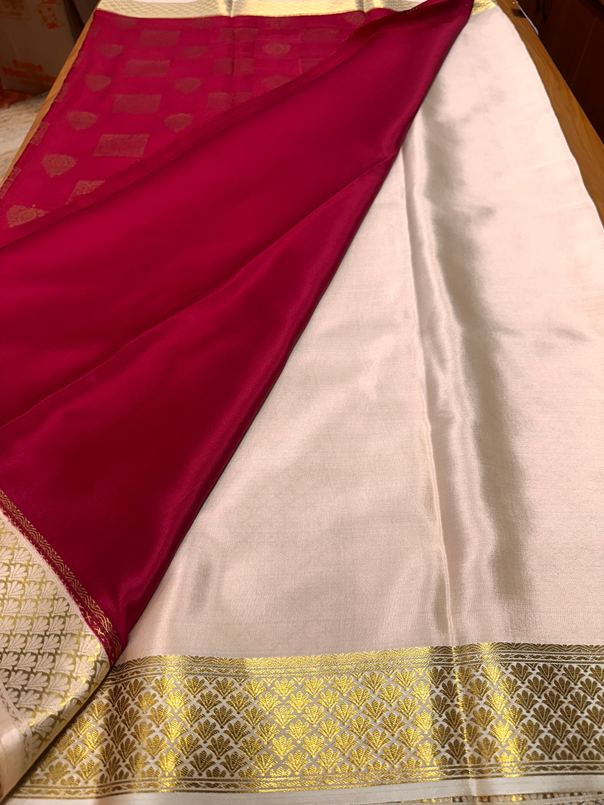 Red with cream border, pure crepe Mysore Silk 120 gsm