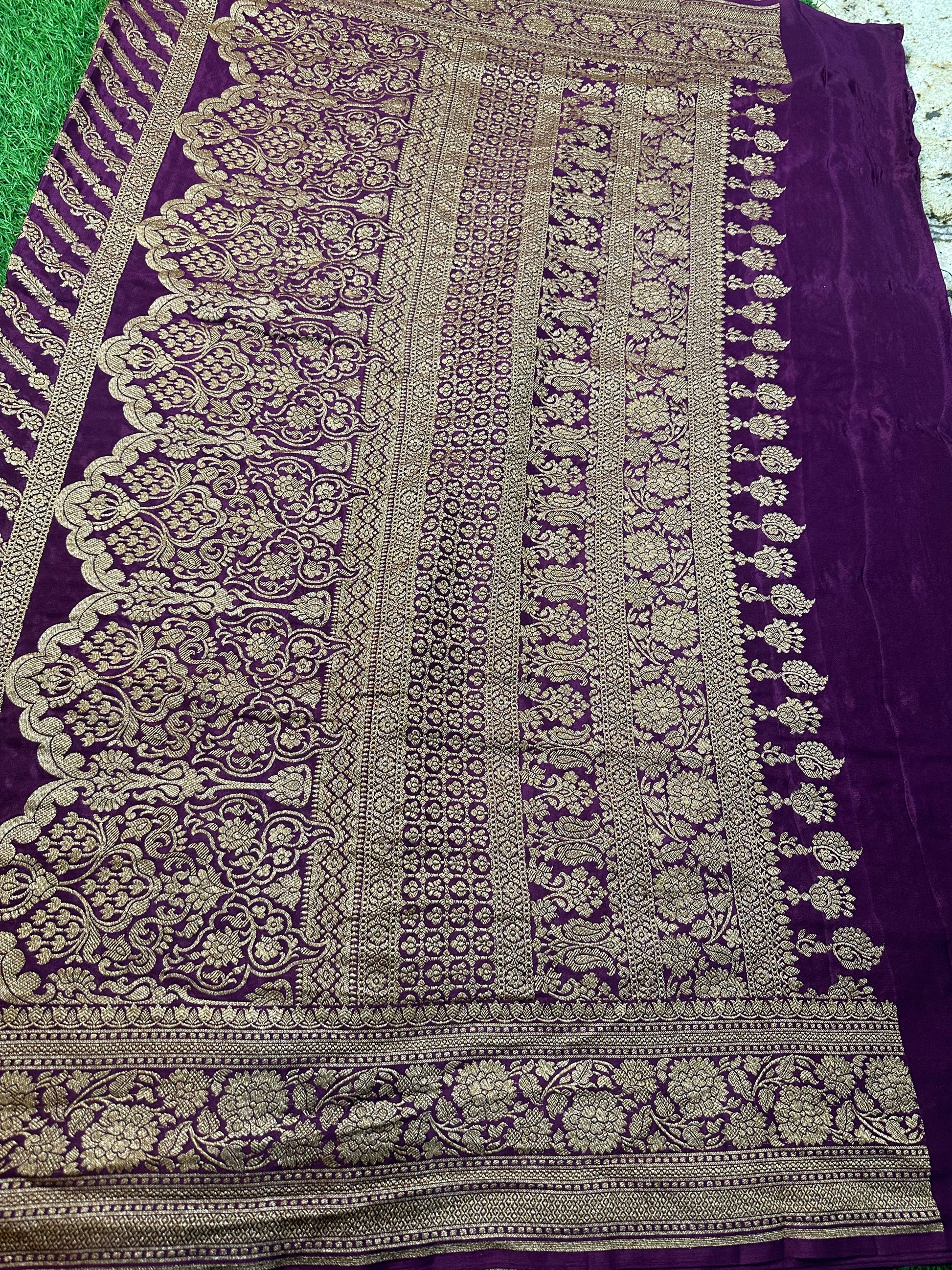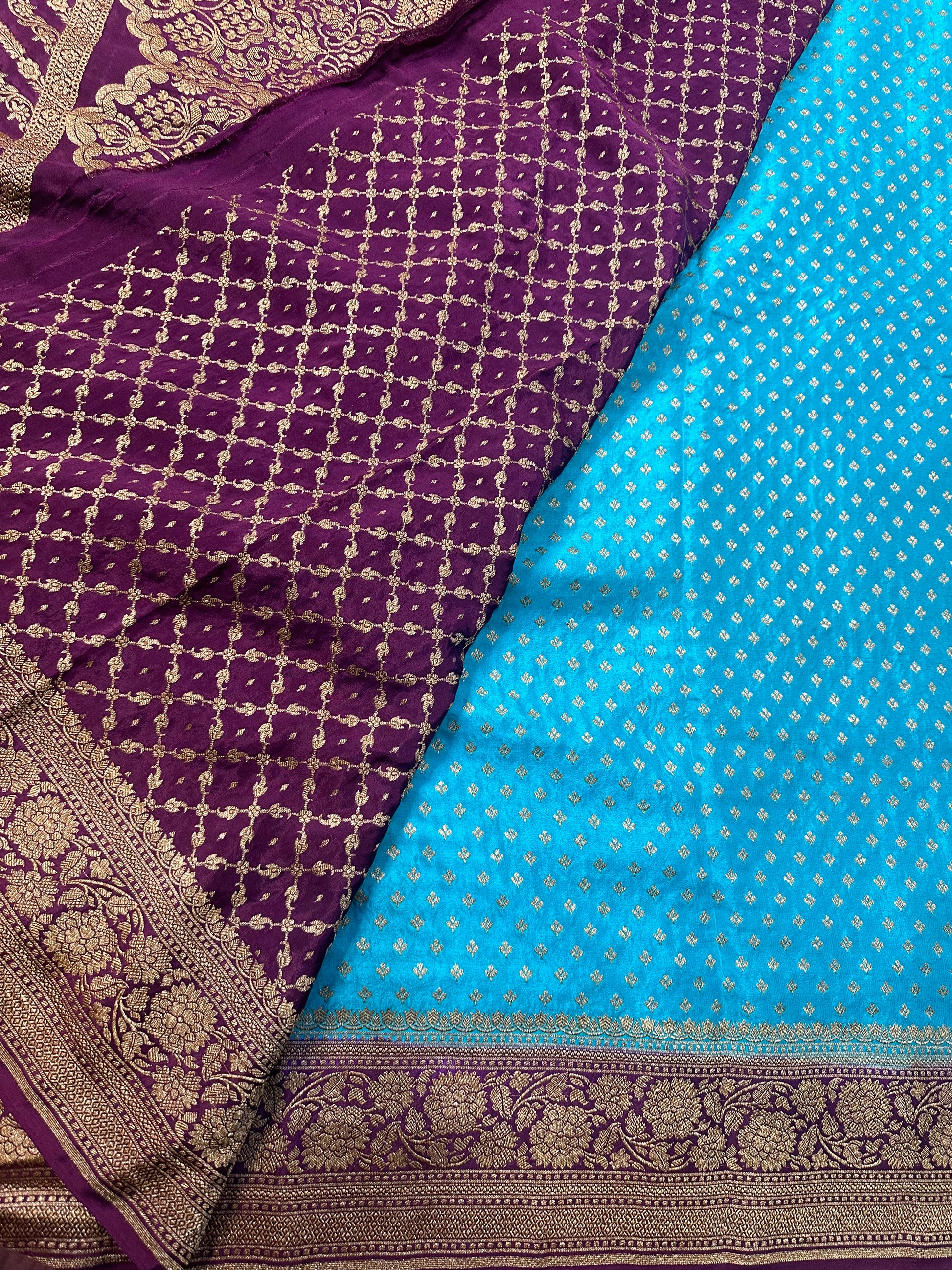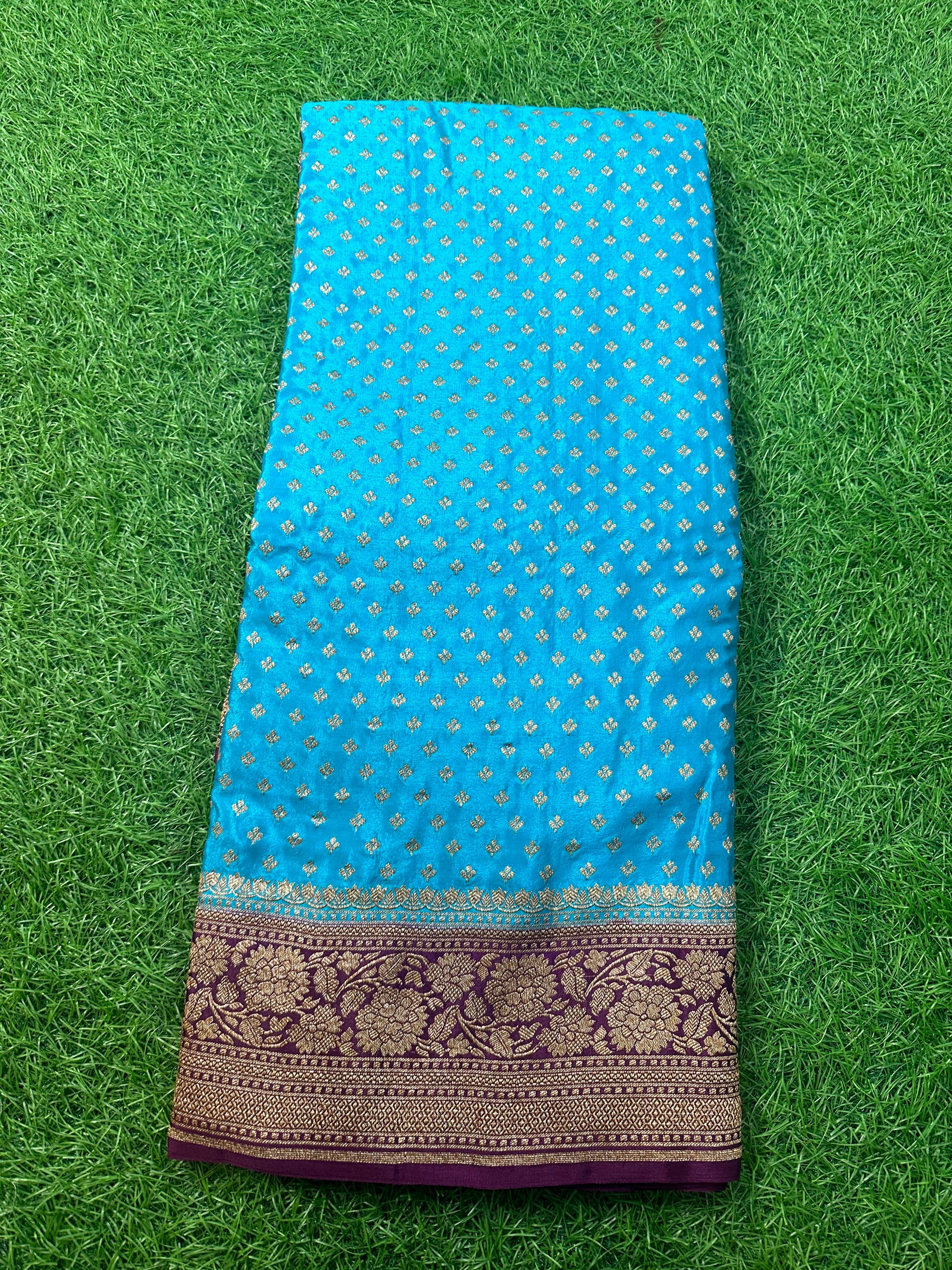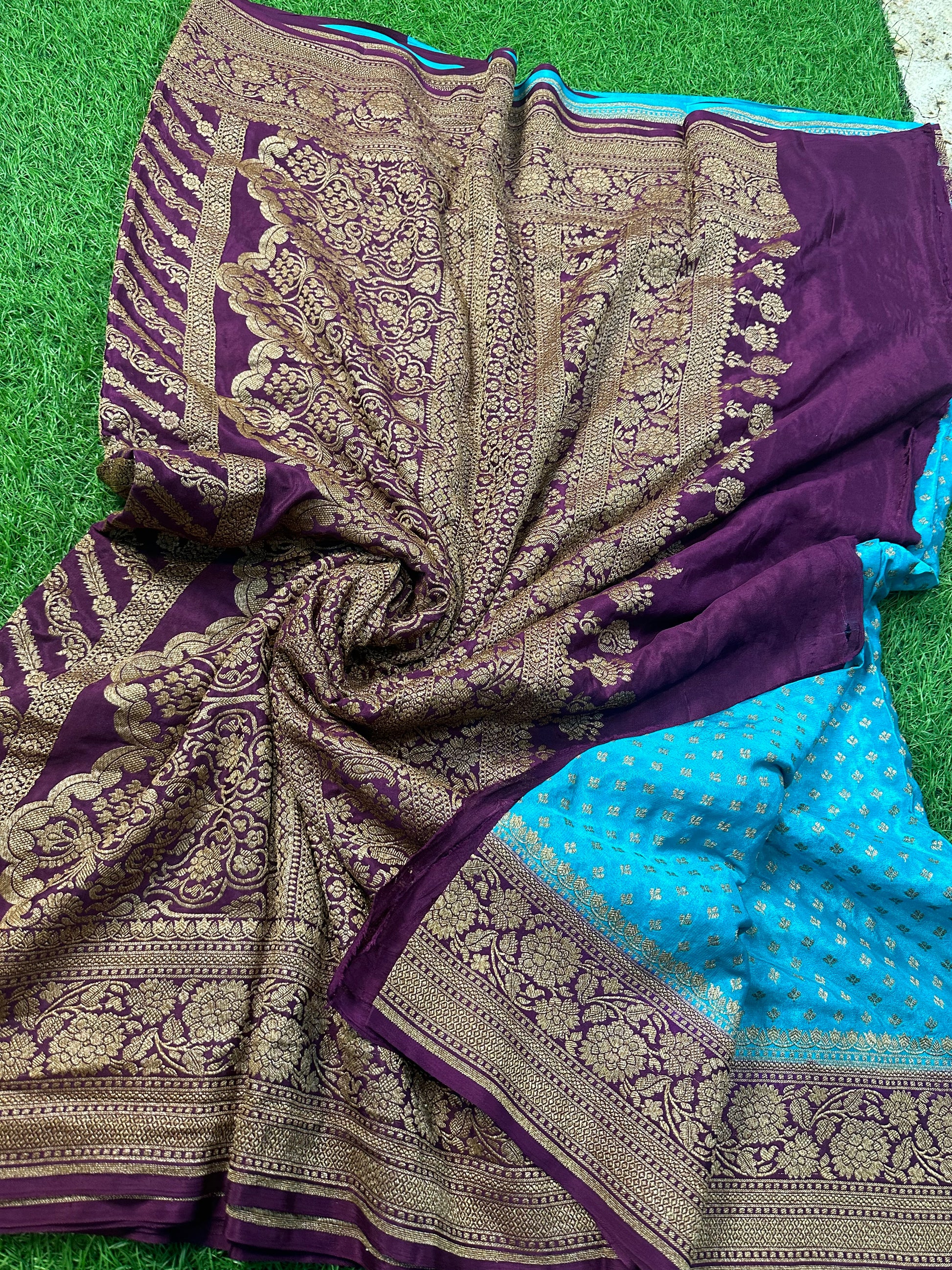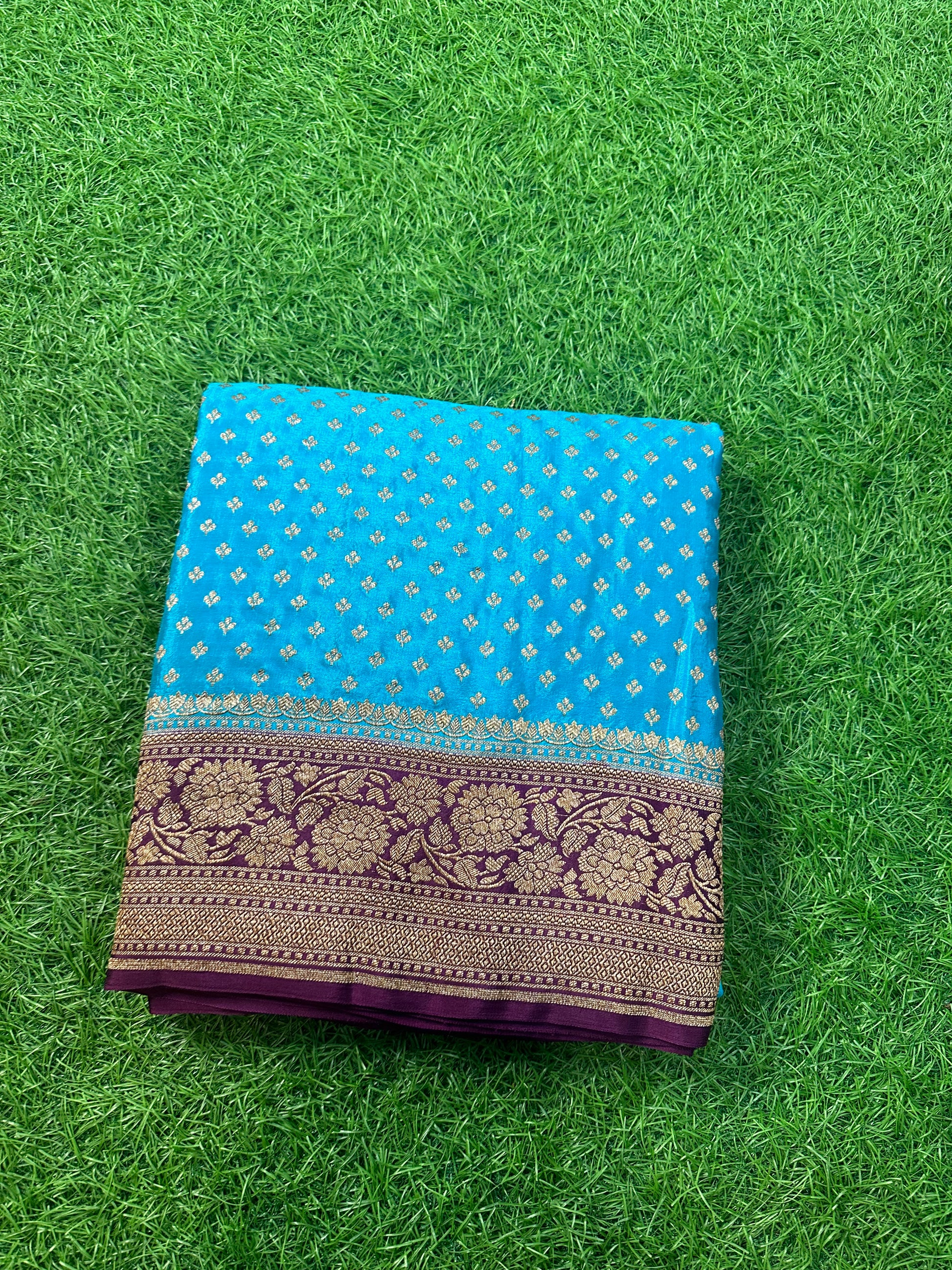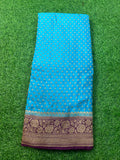 Sky blue and chocolate brown pure crepe Banaras silk.
