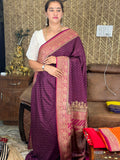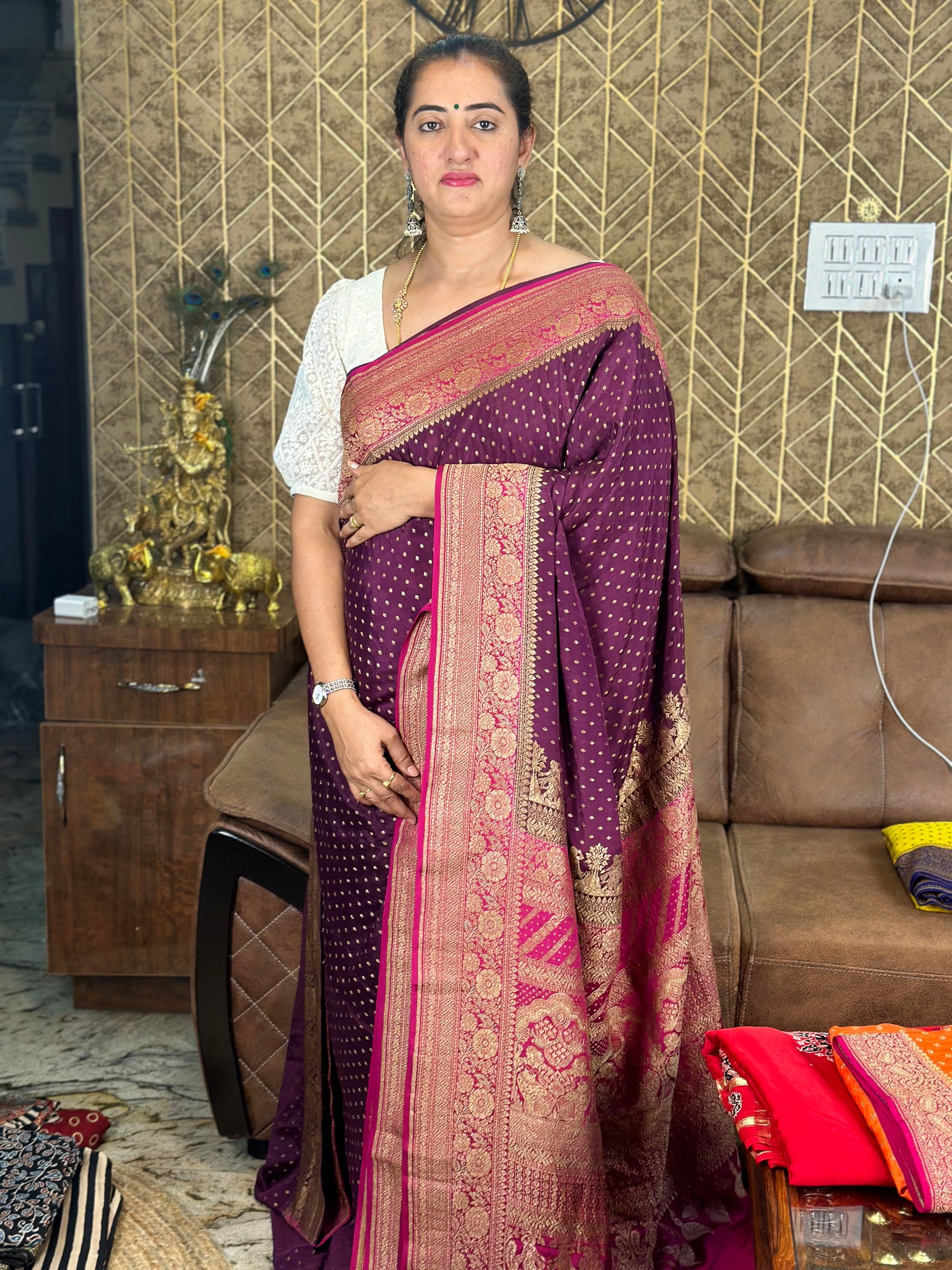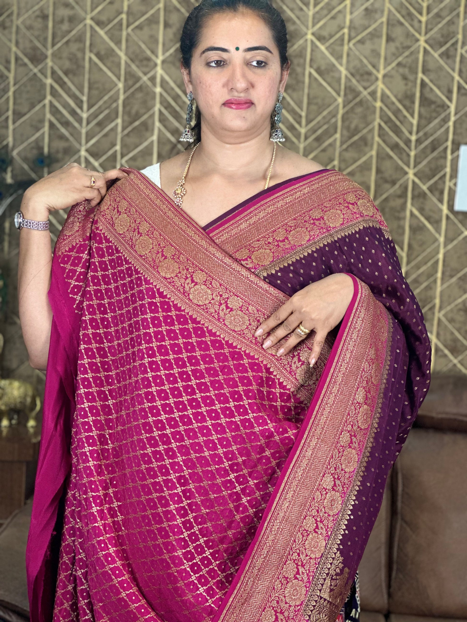 Wine and pink pure crepe Banaras silk sarees. With brocade blouse.