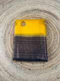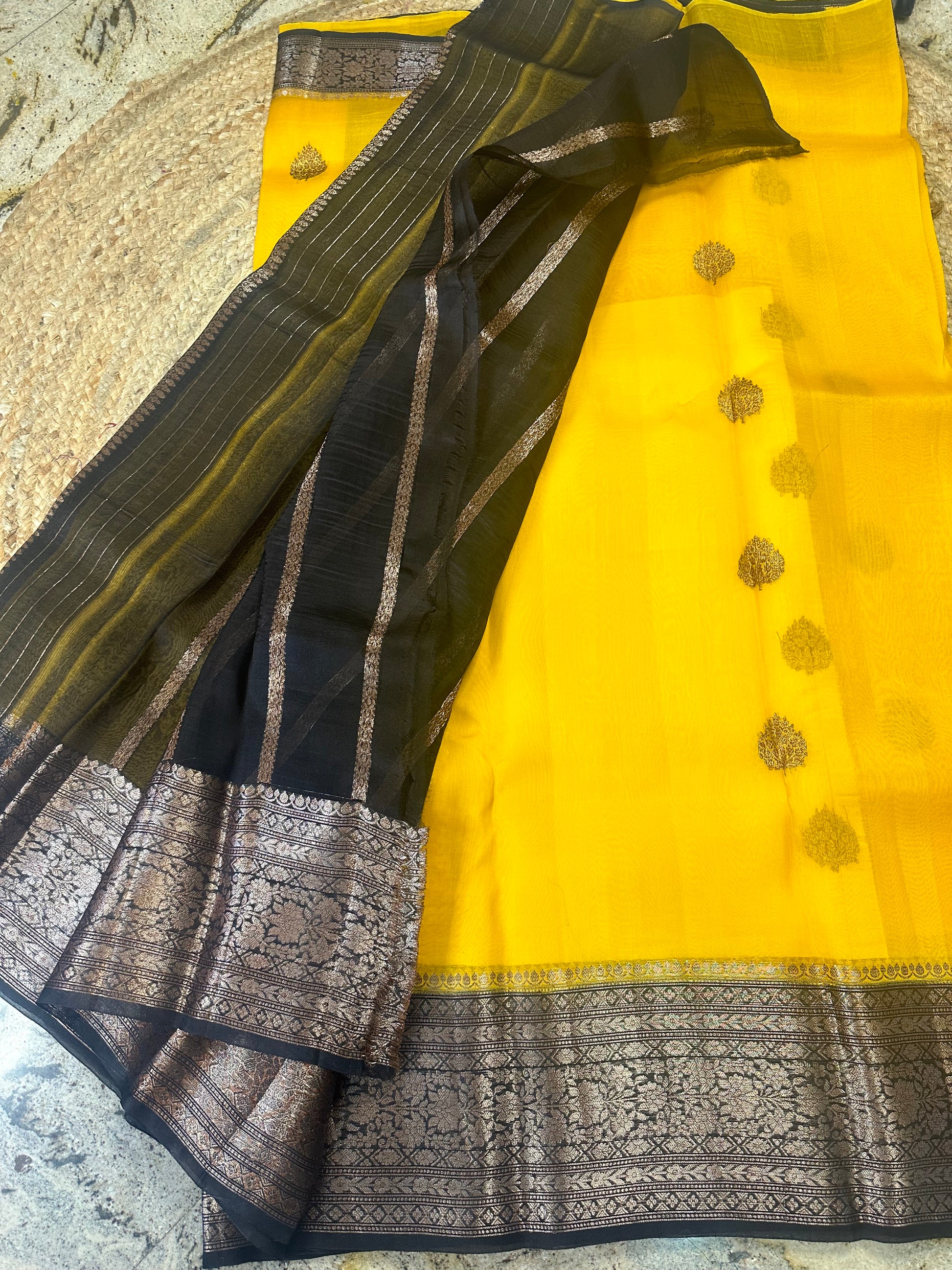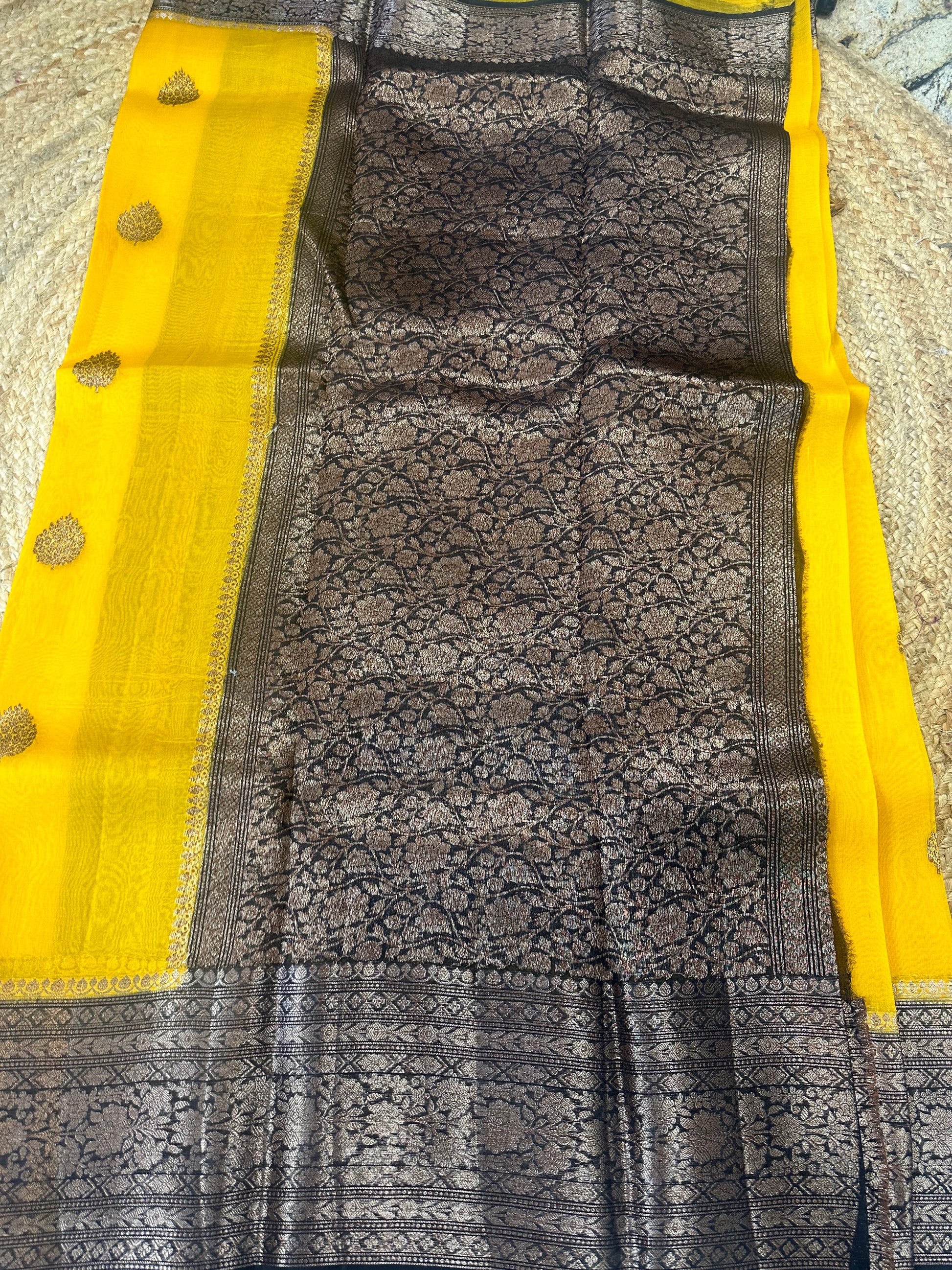 Yellow and black pure kora organza Banaras handloom silk sarees.