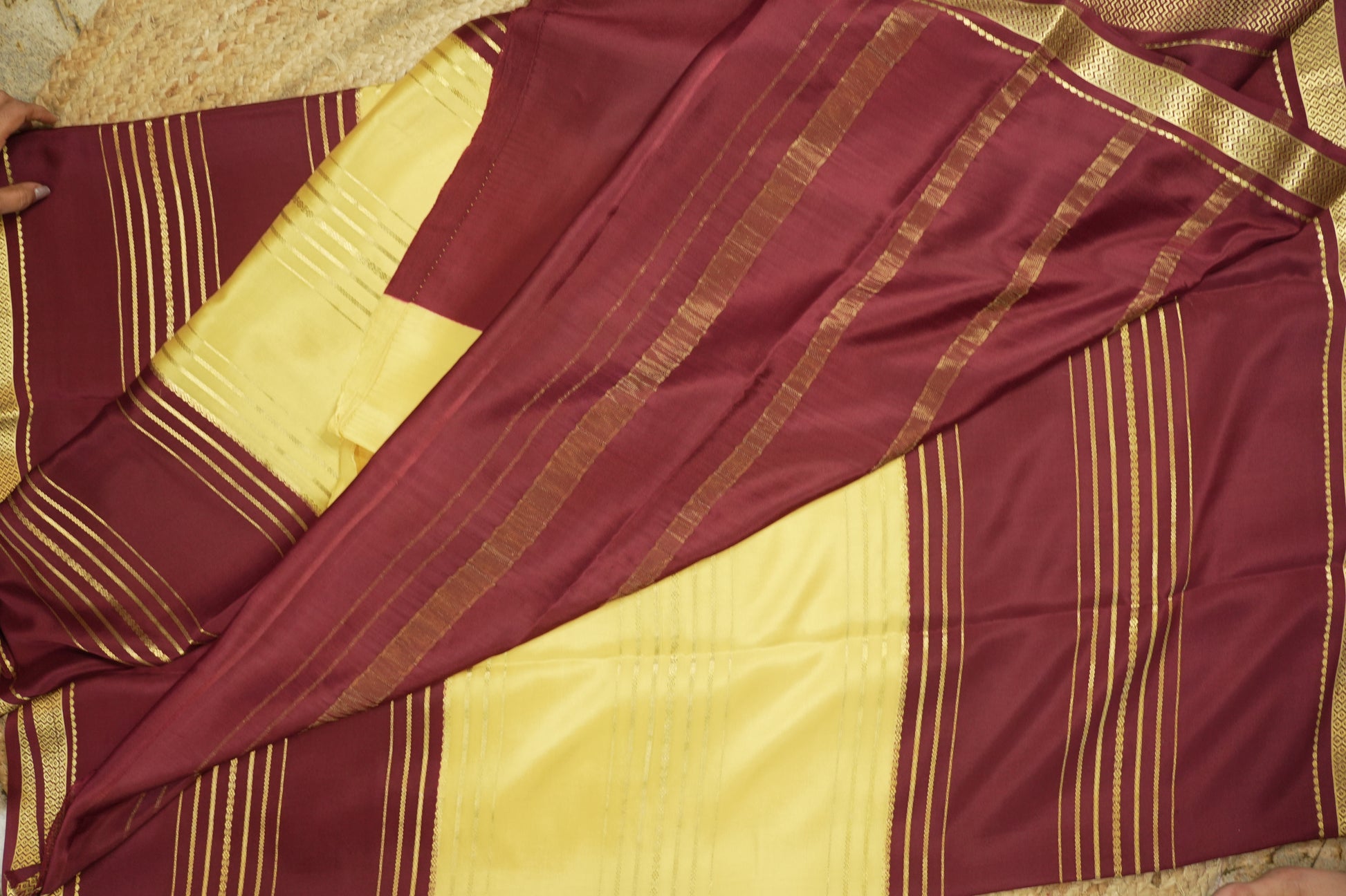 Yellow and coffee brown pure mysore silk crepe with 130 gsm