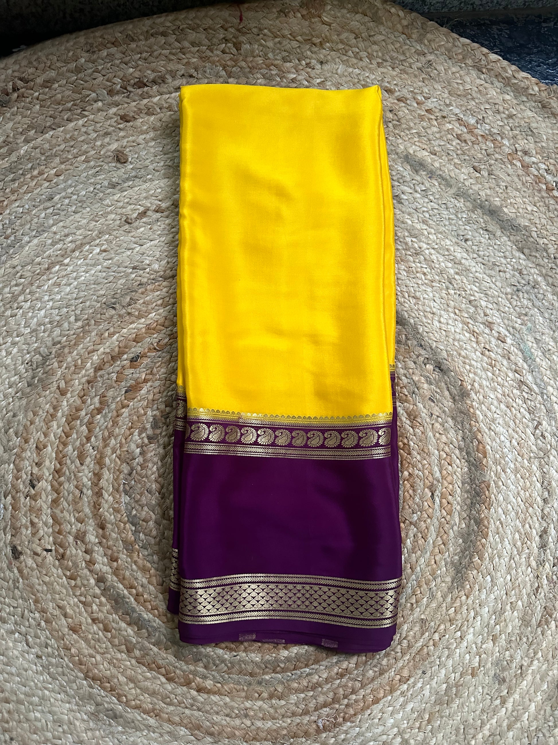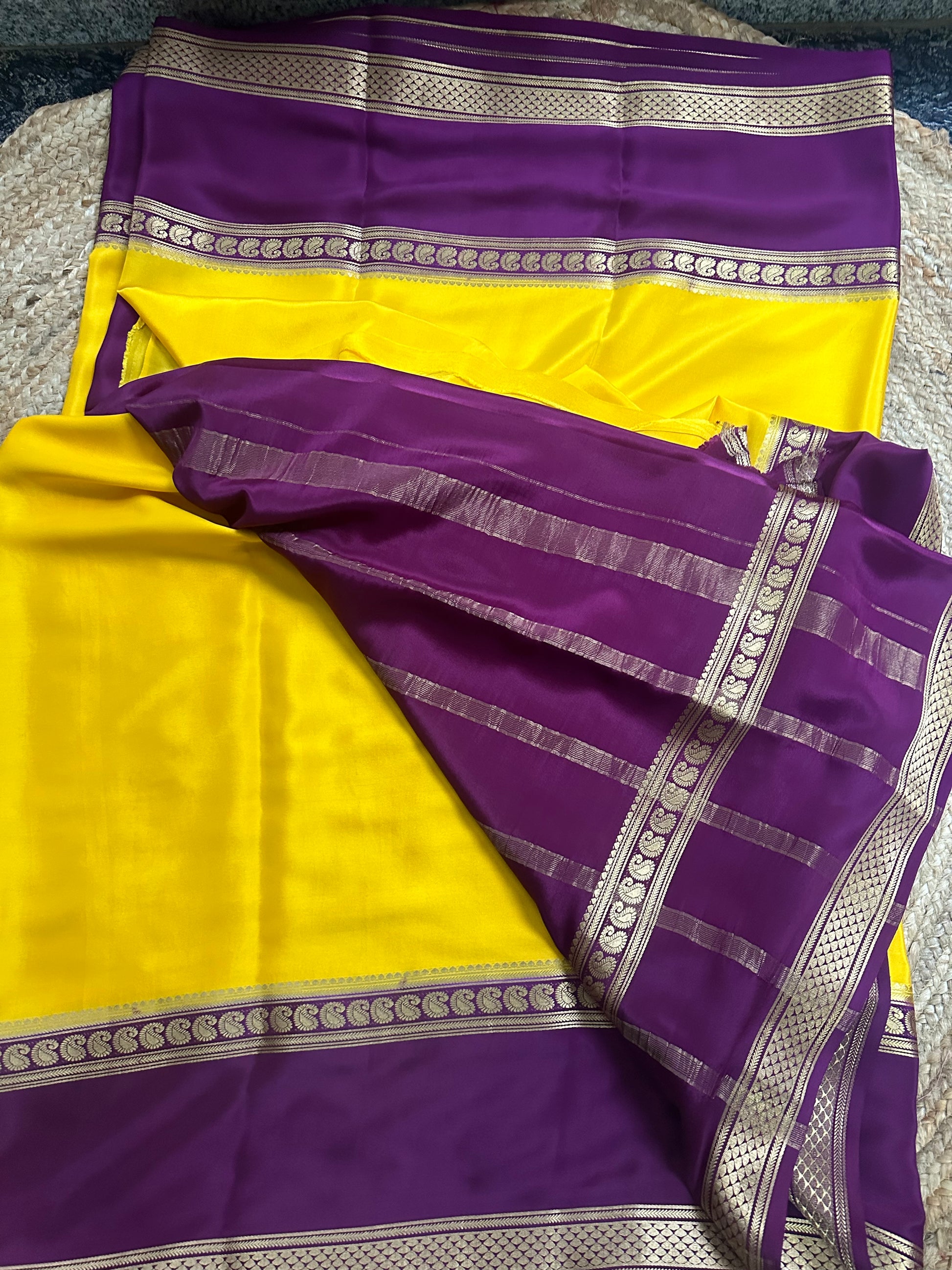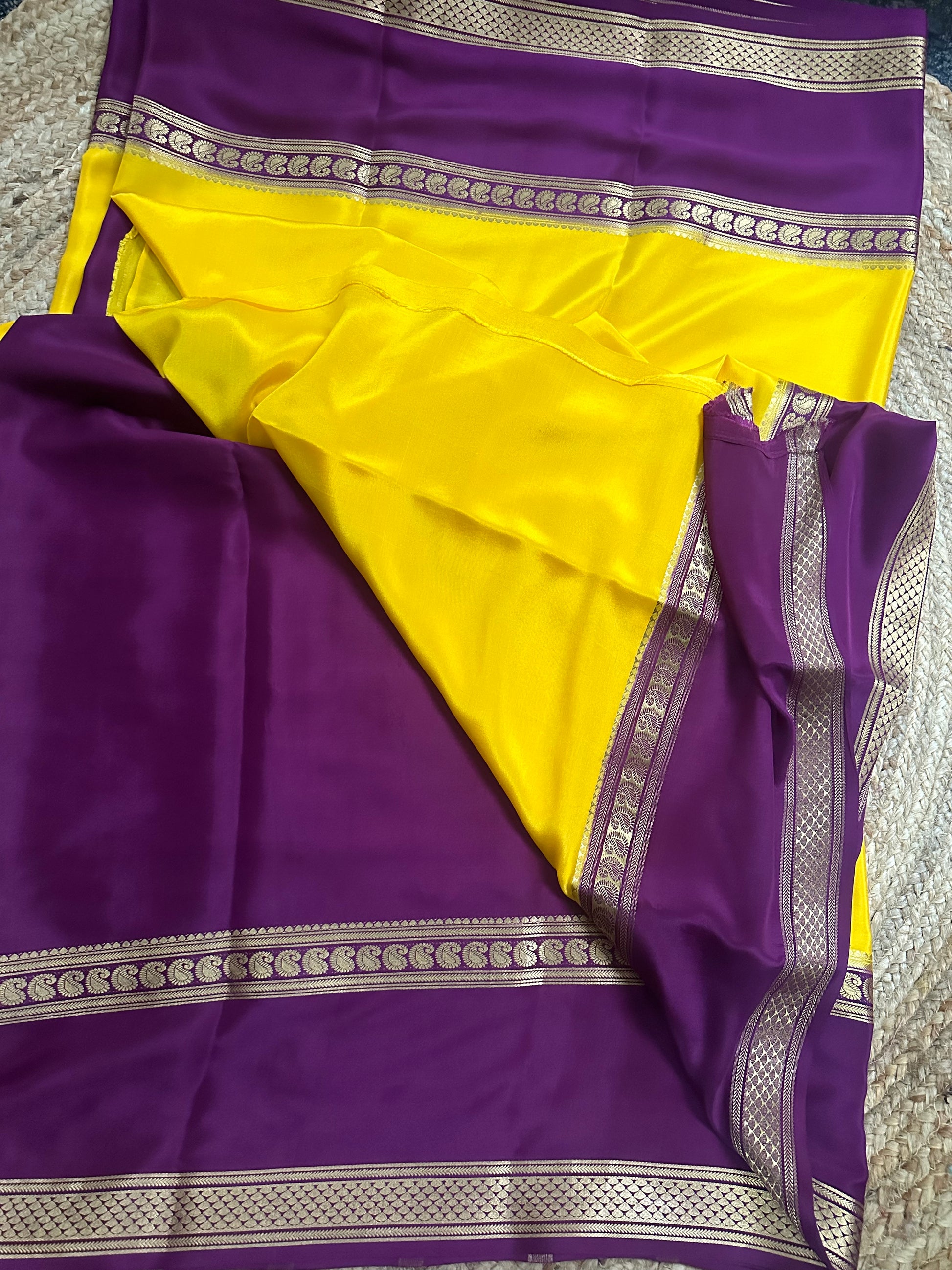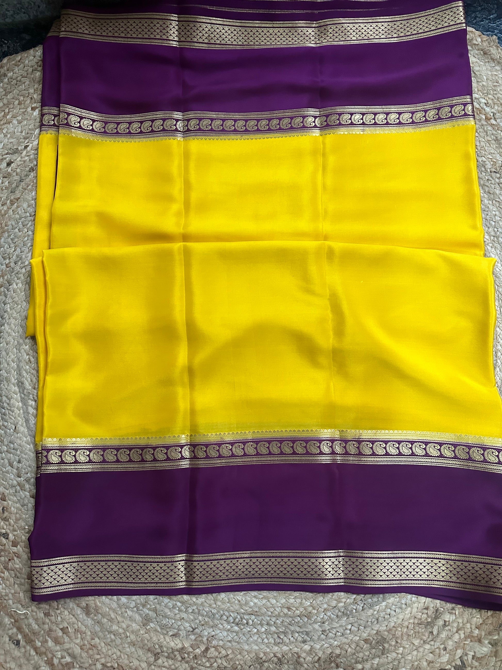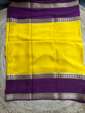 Yellow and dark mejentha mango bentex border pure crepe Mysore Silk crepe 120 gsm.