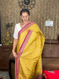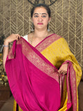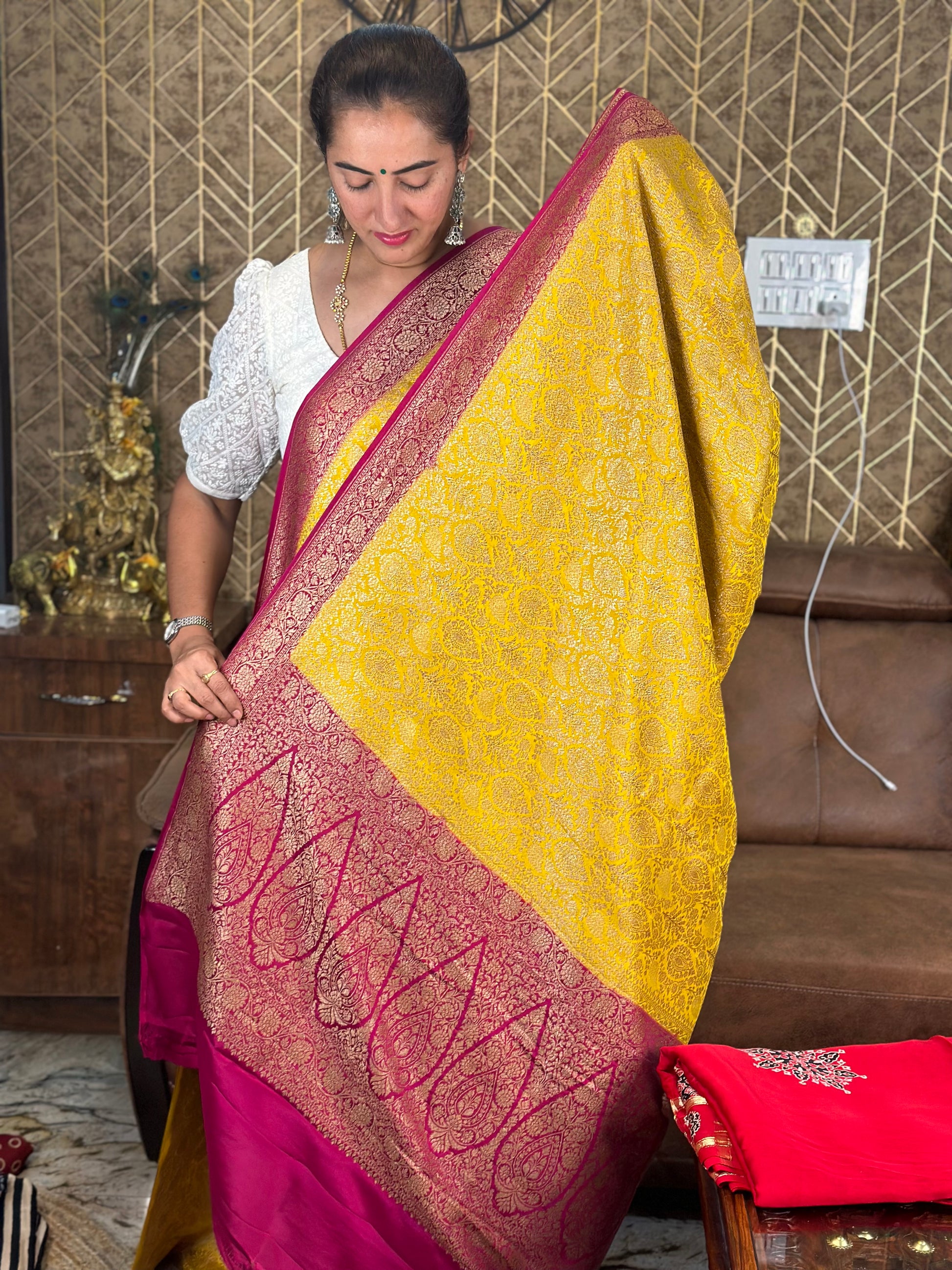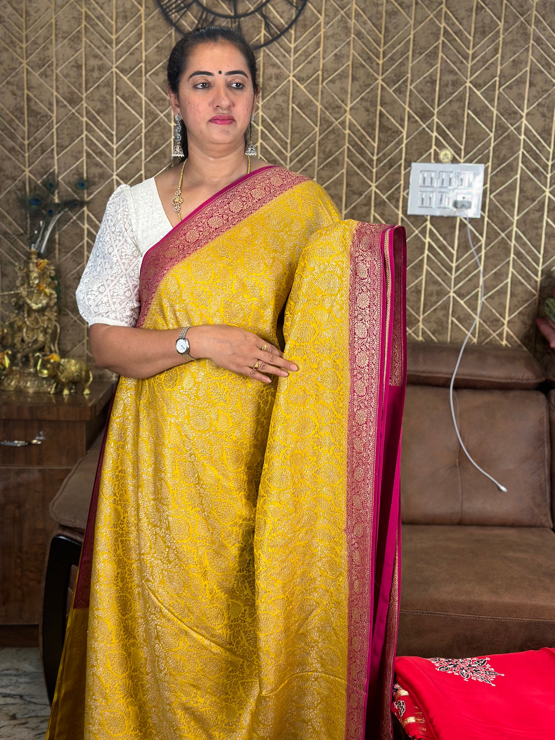 Yellow and pink brocade pure crepe Banaras silk sarees.